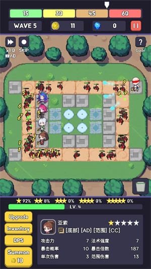 6、击败小兵能获得金币和经验,金币能召唤英雄,经验可以提升等级,升级后就能获得新的强化效果。