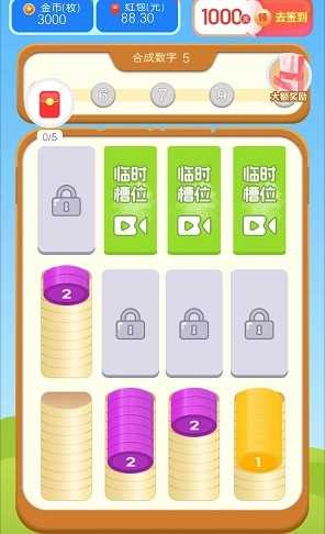 游戏里新增了合成玩法,玩家可以持续合成数字硬币,以此获取较多金币,当金币累积到特定数量时即可进行提现。