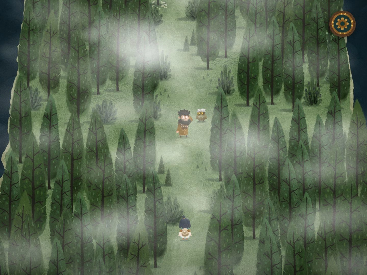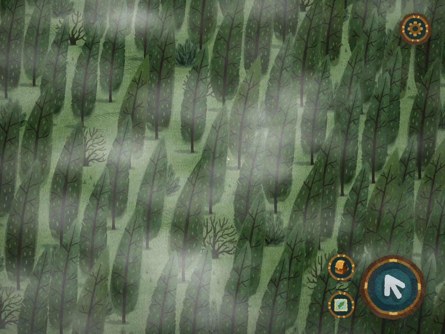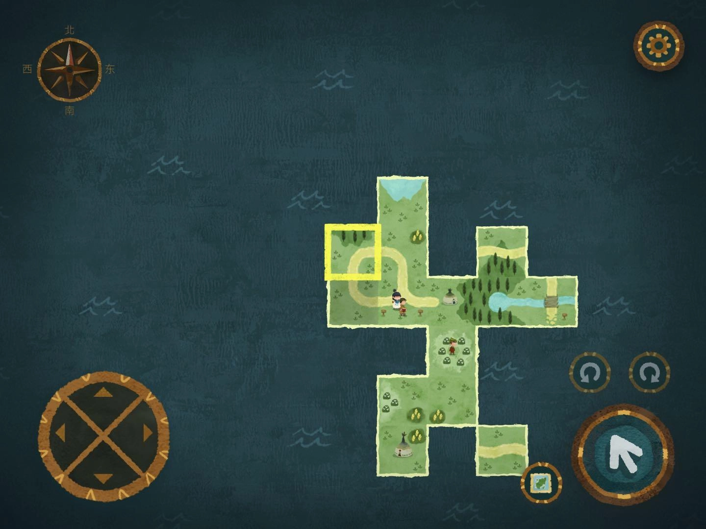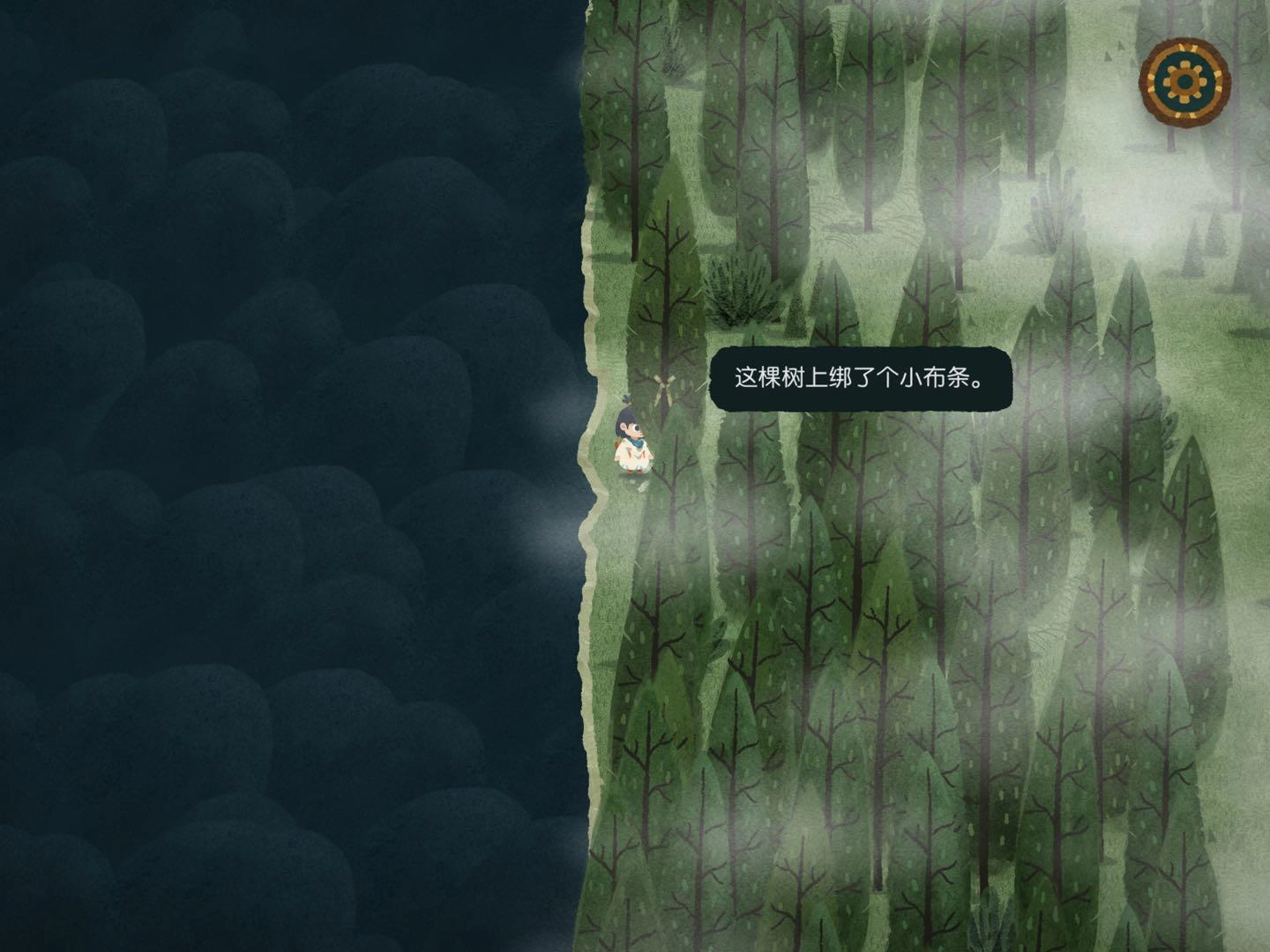 2.寻找森林的路,此处感谢迷失攻略组,我也没弄明白,看的攻略,哈哈哈哈,尽量自己玩,看攻略游戏进程太快,一会就玩完了。。。进入任一个地图碎片后寻找树上的小布条,例如下图所示在西方,就把另一片迷雾地图碎片放到西方,进入地图碎片时出现音符即正确,出现问号时即错误