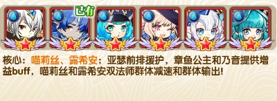 核心:喵莉丝、露希安;亚瑟前排援护,章鱼公主和乃音提供增益buff,喵莉丝和露希安双法师群体减速和群体输出!
