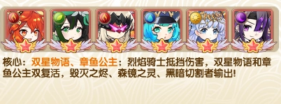 核心:双星物语、章鱼公主;烈焰骑士抵挡伤害,双星物语和章鱼公主双复活,毁灭之烬、森镜之灵、黑暗切割者输出!