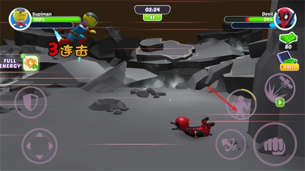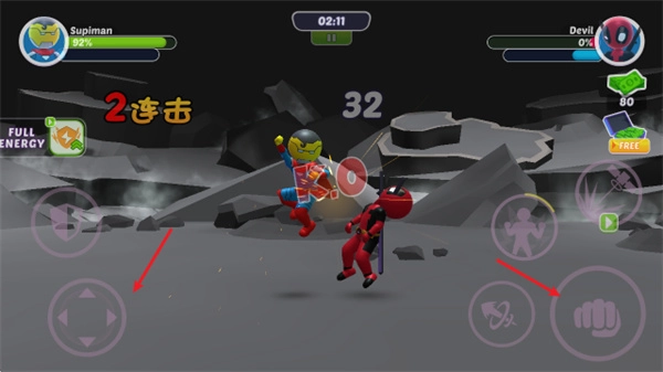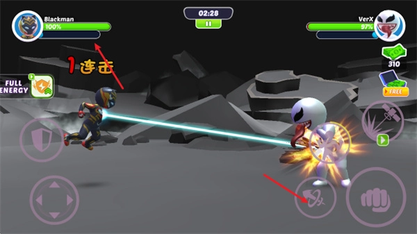 2、进入战斗后通过左侧摇杆操控角色移动而右侧拳头按钮用于近战攻击,掌握一定的操作后可试着连续点击以形成连招释放强而有力的拳击。
