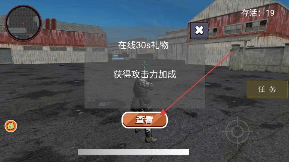 4、当获得在线30s礼物并提示获得攻击力加成时,点击查看按钮了解加成的具体情况,然后继续在战场中战斗完成生存任务。