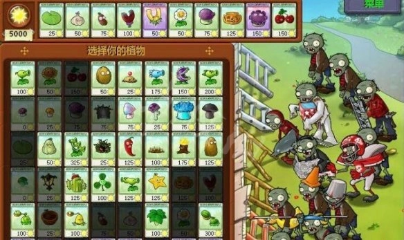 1、为了更快赚到金币,选择“谁笑到最后”这个模式,该模式的设定为:开局拥有5000阳光,且每过一波后获得250阳光、可以提前摆阵,植物无冷却,这样可以使阵容快速成型了,但不能选择向日葵、阳光蘑菇和免费的2种蘑菇。僵尸防御高的有铁桶、橄榄、铁珊门。特别要注意小丑僵尸,被炸掉一个植物就损失惨重了,所以要将其快速解决掉。如下图为选择的植物,为了赚金币,缺一不可。