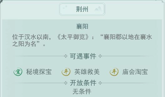 Ps:不同地点所触发的事件有对应的宜/平/忌,如果是宜事件,所需江湖属性的标准就会降低,如果是忌事件,所需江湖属性的标准就会提高,所以大家一定要选择宜/平的地点去触发对应事件。目前在行囊中放入物品,就可以自动识别可触发事件以及对应的酒和宜/平/忌的道具,更加方便大家选择。