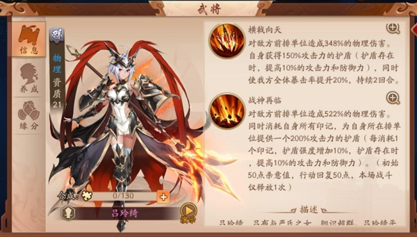 简介:上阵父女兵,形容的就是吕布父女。继承了父亲的意志,同样手持方天画戟的吕玲绮,在伤害上并不逊色。与吕布一套爆发伤害的不同,吕玲绮更重要的是在战斗中攻防的增益,护盾的加身,保持着吕玲绮一直拥有着惊人的战斗状态,持续输出,同时高星的吕玲绮还可以打出眩晕控制,简单有效,并不花哨,目标很简单,就是输出,和制造输出空间!在吕氏父女眼中,进攻,就是最好的防守!