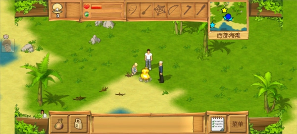 主角从噩梦中醒来,得知救生艇触礁,大家都被冲到了岸上。大家齐心搭好了帐篷。和大家对话,可以得到一个苹果。并在伊莎贝尔和迈克那接受两个任务: