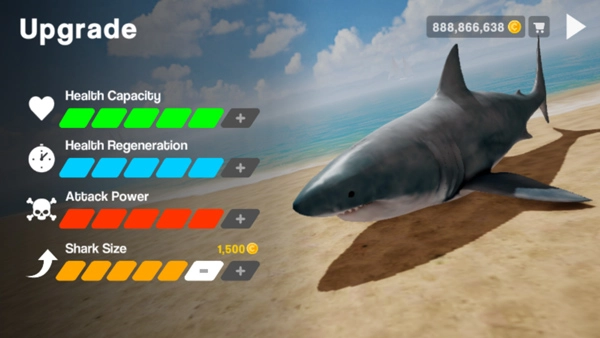 7、金币可用来解锁提升鲨鱼的能力;