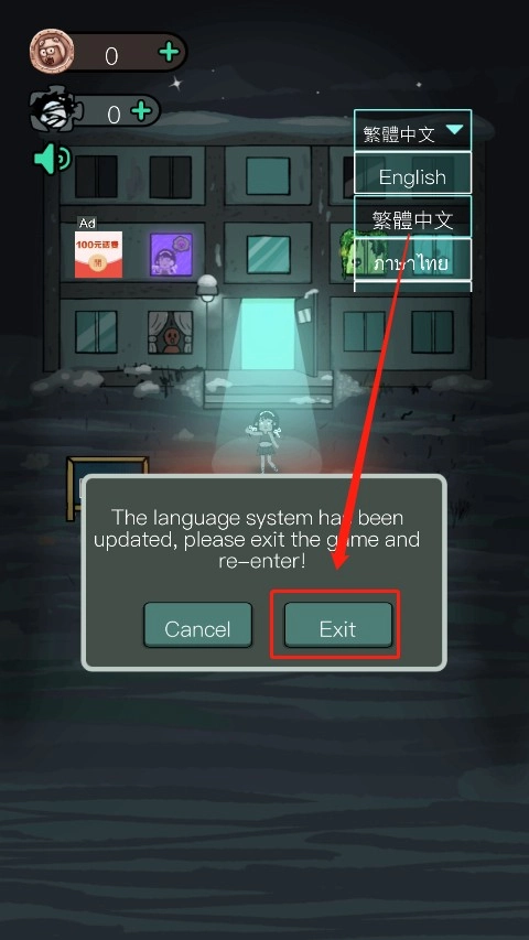 3、切换成功后会出现下图所示的提示,此时需要重启游戏来让语言替换效果生效,点击下图所示的位置也可以快捷关闭游戏。