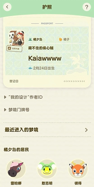 界面仿照真实护照设计,主色调是清新的动森绿。