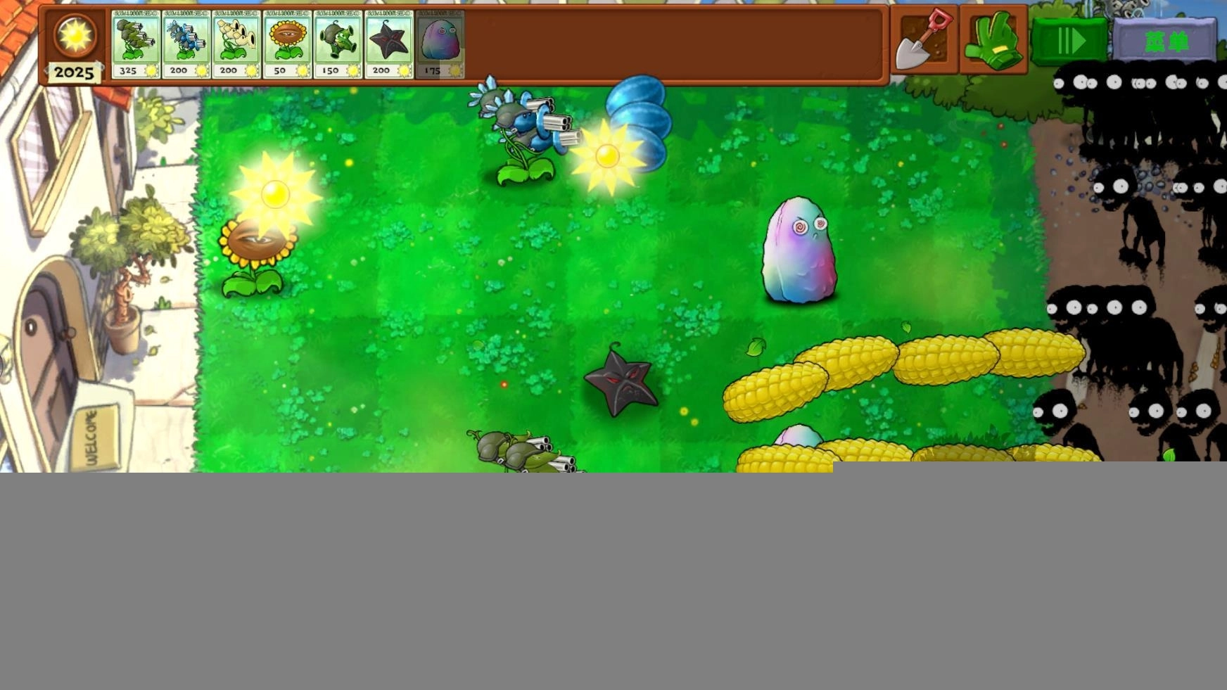1、及时的在路线上布置植物,各种的都有,形成一个强大的火力网,疯狂的攻击。