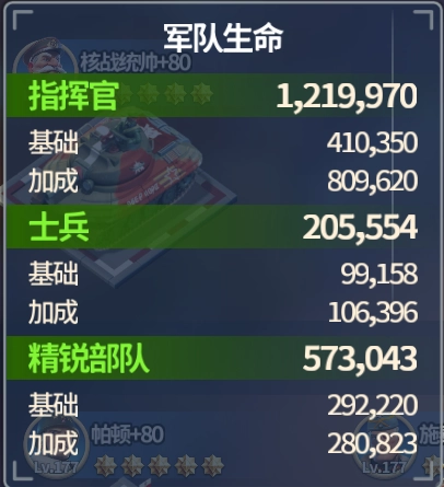 军队攻击力和生命值与指挥官、士兵、精锐部队的属性息息相关,三个方面都由【基础】和【加成】两部分组成!