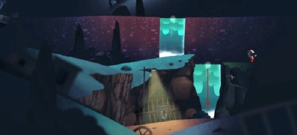 3、走一会儿会碰到比较宽的路,按住不松手一直向下拖动,就能看到新的道路了。在新场景里我们能看到瀑布(海底也存在瀑布),从这里跳下去。