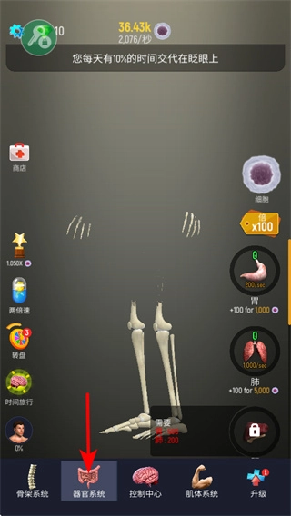 3、点击器官系统,可解锁和升级人体器官如肺、胃,是完善人体结构的核心步骤,资源情况解锁关键器官。