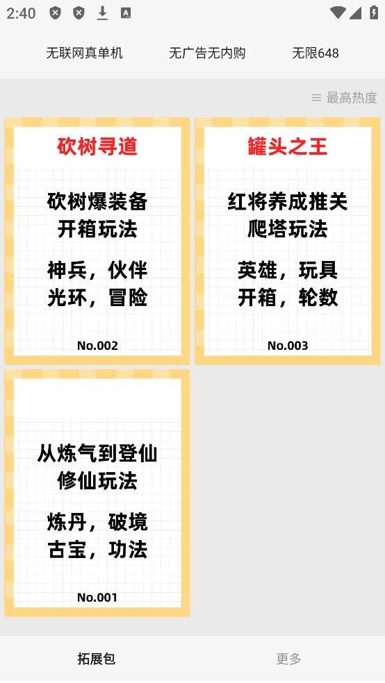 目前这款游戏内有3个拓展包可供游玩,分别是“砍树寻道”、“罐头之王”和“逍遥修仙”。