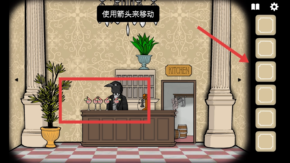 3、进入旅馆的各个场景后,可通过界面上的箭头按钮操控角色移动或切换场景;点击场景内的物品能够进行收集与互动,借助解开谜题来解锁新的区域和剧情。