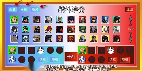 3、开战前需要选择你的忍者,还有秘卷和通灵。