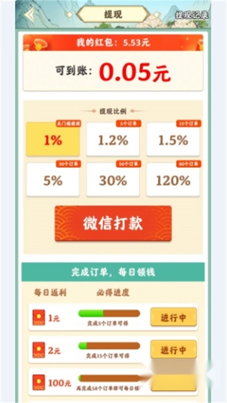 是真的,平台总共提供了游戏红包、游戏零钱、收集百草这三种赚钱途径。先来说说红包赚钱的方式:除了完成订单可以获得红包外,游戏里还有固定的NPC剧情,触发这些剧情后观看广告也能领取到红包奖励。
