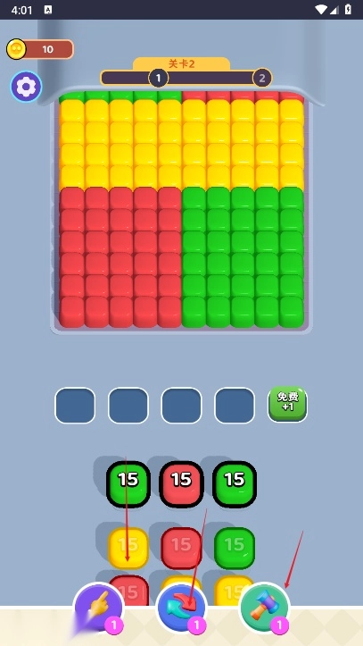 使用时机选择:根据关卡中的实际情况,合理选择使用道具的时机。若上方堆叠的砖块颜色繁杂,难以快速找到消除路径,可使用“全局扫描”道具,它能瞬间标记出所有可消除的同色砖块组合,助你迅速规划消除策略。当遇到某个关键同色方块,但其周围被其他颜色方块重重包围,难以直接射击命中时,“穿墙子弹”道具就能派上用场,该道具可让子弹穿透障碍,精准击中目标方块。