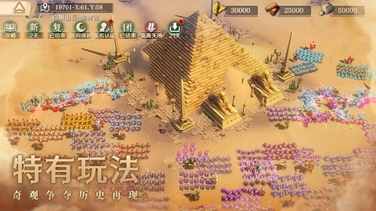 2.文明与征服将战略与吃鸡完美结合,创新打造独具特色的千人战略吃鸡模式,启动游戏、动城跑毒、偷城开发等丰富的游戏玩法,让“文明吃鸡”精彩有趣。