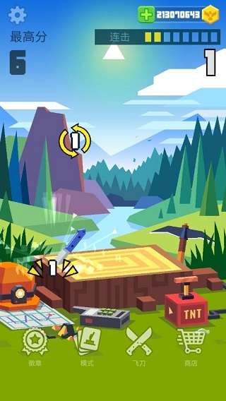 在连击模式中的规则十分简单,游戏开始时我们的刀具将以竖插在树桩中的姿态出场,而我们要做的就是选择刀具不同的部位后将其以一定的力度和方向上拉、到达一定程度后放手:此时刀具就会沿着之前玩家给予的轨迹滑动、旋转,而唯一的要求就是刀具落下时刀尖必须朝下,这样才能继续立于砧板之上。