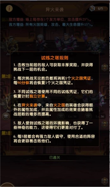试炼之塔分为五个宝塔,每一个宝塔分别对应五个国家,玩家们可以以爬天梯的方式通过宝塔的每一层关卡从而完成任务获取星星从而领取奖励