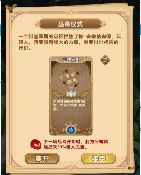 冒险家们如果选择前往“巫毒仪式”中,玩家参与仪式可以获得一张卡片来帮助提升战斗力,但有失必有得,获取卡片也是需要付出相对应的条件代价的哦!