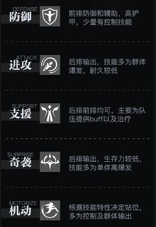 战姬共有5种职业,分别为防御、机动、进攻、奇袭、支援