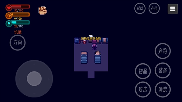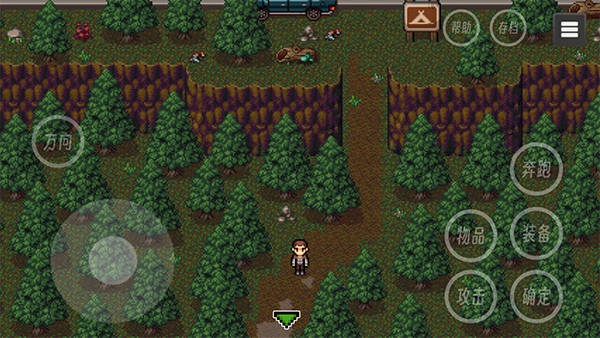 2、操作界面延续经典设计,左下角轮盘控制移动,右侧显示物品与装备状态栏,右上角设存档与生存指南;