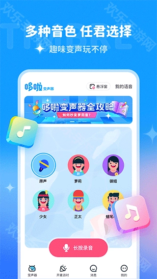 1、打开哆啦变声器,这里有超多网红音色供你挑选,选好你喜欢的音色后,长按就能开始录音啦。