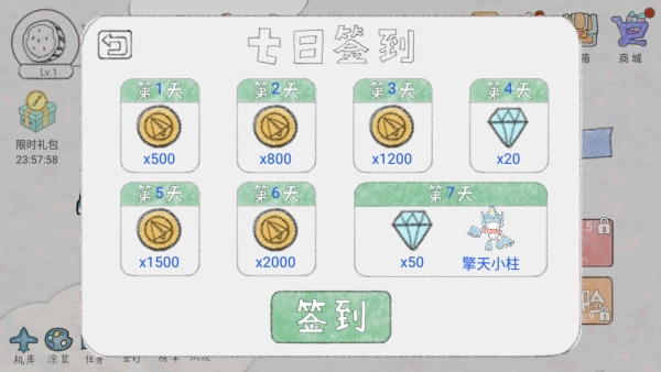 2、专业的签到功能,每日都会领取金币钻石,解锁新飞机。