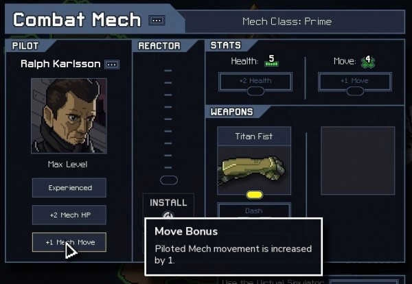 每个机甲都由一名机师驾驶,当他们升级时,会自动解锁被动技能。 在每次“战役”重新开始时,你可以选择一名已经解锁一项被动技能的机师。 对于初学者来说,Abe Isamu是一个不错的选择,因为他能够增加机甲的装甲,降低直接攻击造成的“1点”伤害值。 在游戏初期,Abe的机甲可以作为小队中的Tank去吸收怪兽造成的伤害并阻止其对建筑物的射击。 如果你疏于谋略,Isaac Jones给你一次额外“重置”(Reset)战斗的机会。 另外,高级的机师需要“能力核心”来激发他们的能力,也就是说他们需要坚持到战役后期才会有用武之地。 最好留给更有经验的玩家来指挥他们吧。