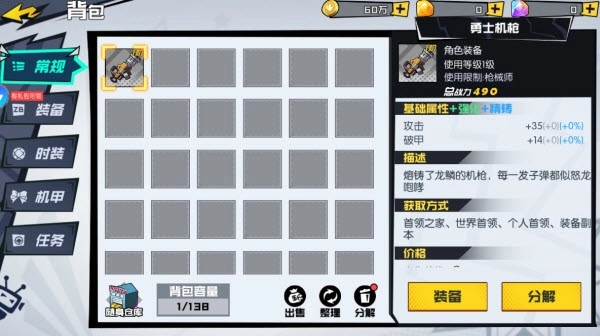6、打开可以穿戴我们获得的装备以及分解不需要的装备,提高我们的战力。