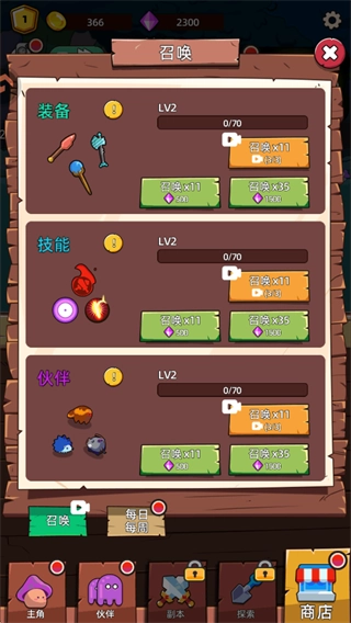 2、当感觉打不过的时候,点击商城去召唤【装备、技能、快伴】