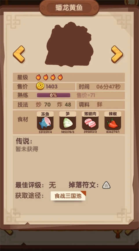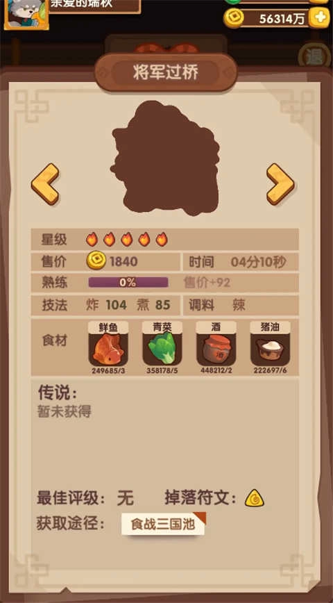 五火将军过桥,炸煮鼓风机菜,贵客是刘关张(与咖喱香辣虾、火焰山冲突),白发做到特级需要一点点遗玉,凯蒂猫特级需要厨具,具体用法需要后续研究一下。这个菜消耗鲜鱼和大量猪油,用它刷符文需注意。