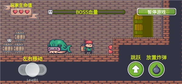 1、第一关的对手是绿色鲸鱼,你得用放置炸弹的方式将其击败,但得把控好时机——要是它靠近炸弹时炸弹还没爆炸,就会被它吞掉。放置炸弹的同时也要注意躲避,一旦被敌人碰到,游戏里就会扣除生命值。