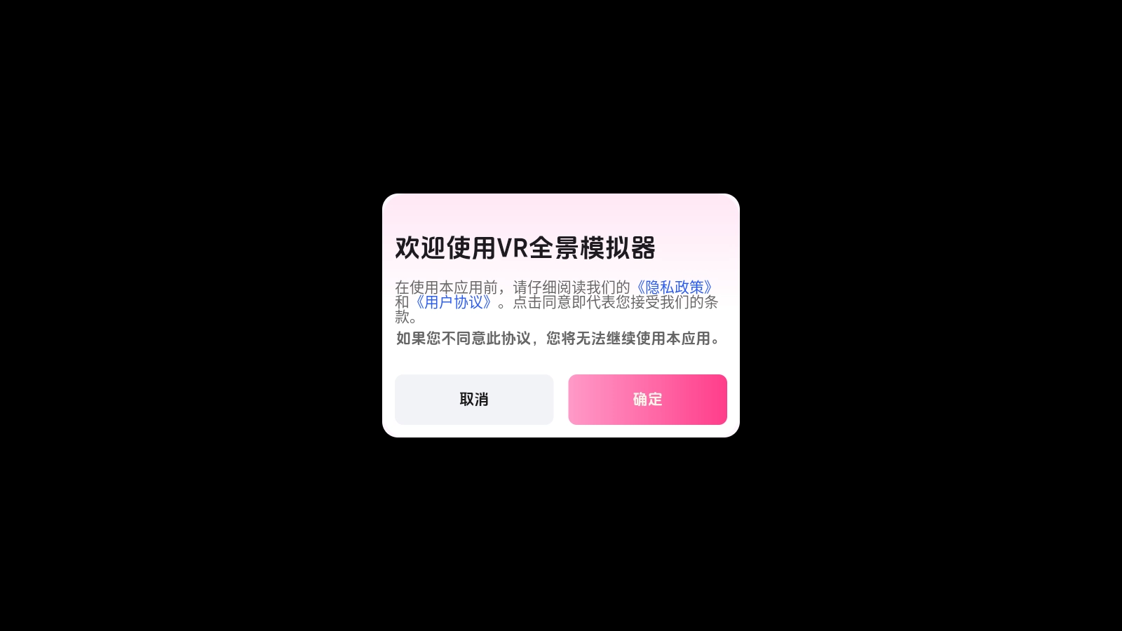 1:打开VR全景模拟器,首先会弹出用户协议和隐私政策提示框,阅读后点击“确定”进入;点击“取消”则退出。