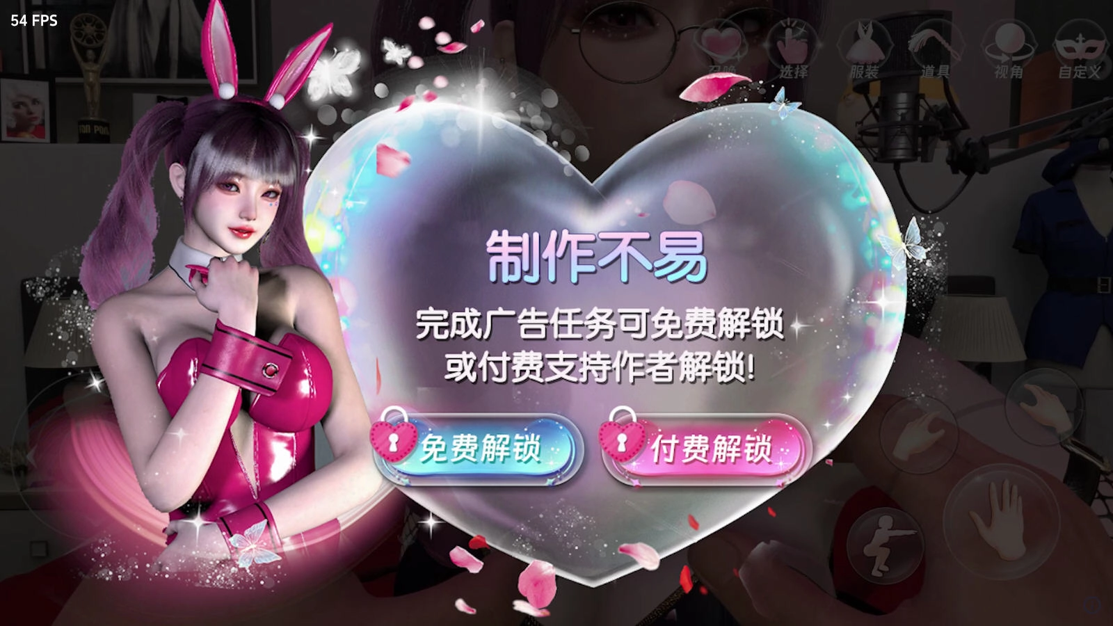11:当出现“制作不易”提示框时,可选择“免费解锁”(完成广告任务)或“付费解锁”来解锁相关内容,继续游戏体验。