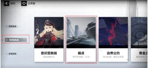 现在下排选择挑战,然后在左侧选择特殊挑战,特殊挑战中的第二个挑战“据点”,就是据点战