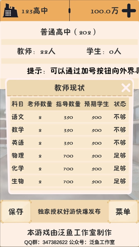 5、在游戏中你需要加强师资力量,努力的培养学生,学生们考得好,有好的大学上,你的学校才会更加出名。