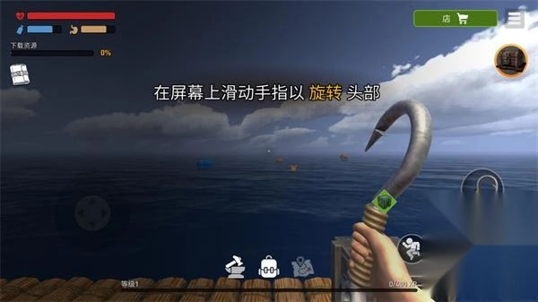 2、这里我们以生存模式为例,进入游戏,我们需要利用操纵杆控制人物角色在木筏和水中移动;