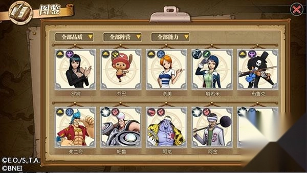 图鉴中的角色分为5种品质,9种阵营,6种能力。每个角色都有着各自的阵营和果实能力,上阵有着相同阵营或者果实能力的角色达到指定数量时,玩家会得到特定的效果加成,可叠加触发。