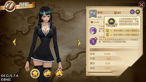 比如罗宾、路飞同属于草帽团阵营,二人同时上阵可触发“同伴激励”效果;罗宾、路飞的果实能力都属于超人系,同时上阵还可触发“超人之力”效果,这两种效果可叠加触发。