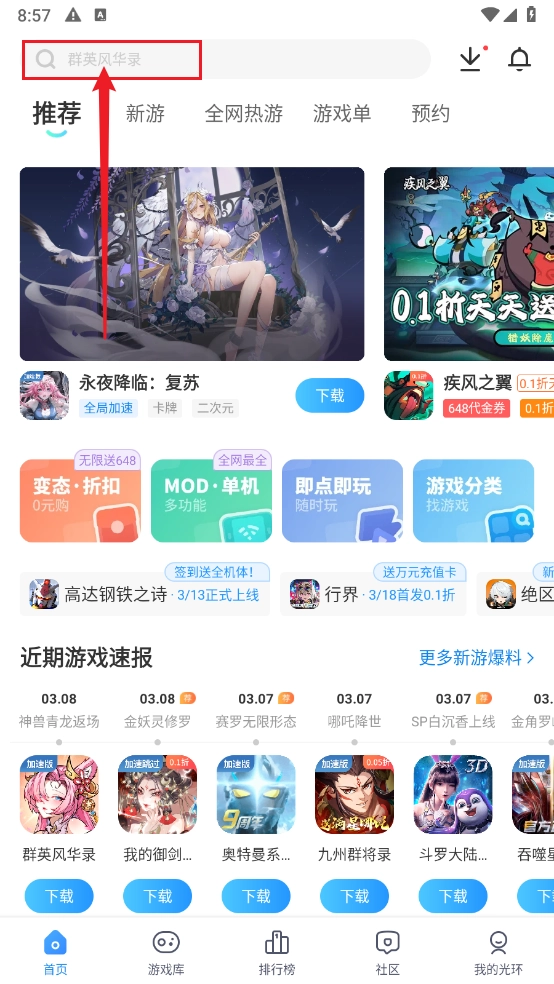 2、如图,一键输入游戏名搜索喜欢的游戏。