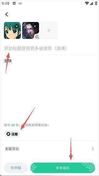 3、点击添加话题,输入你要发布的内容点击发布动态即可