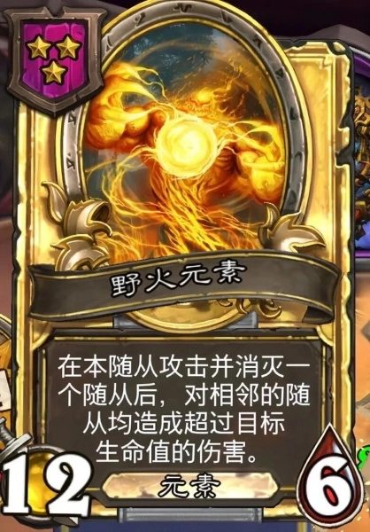 前面的组件基本都是经济和成长卡,核心战力卡没有争议,非三本的野火元素莫属。合金之后攻击消灭一个随从之后,会对相邻的随从造成超过目标生命值的伤害,相当于一个丐版的狂战,最好的情形是套上圣盾,打两拨基本就奠定胜局了。