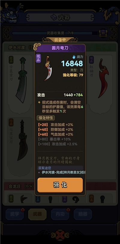 武器继承:武器强化效果可跨武器继承;应对护盾多的首领,可更换圆月弯刀针对性作战。