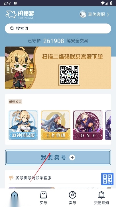 1、点击首页的“卖号”按钮