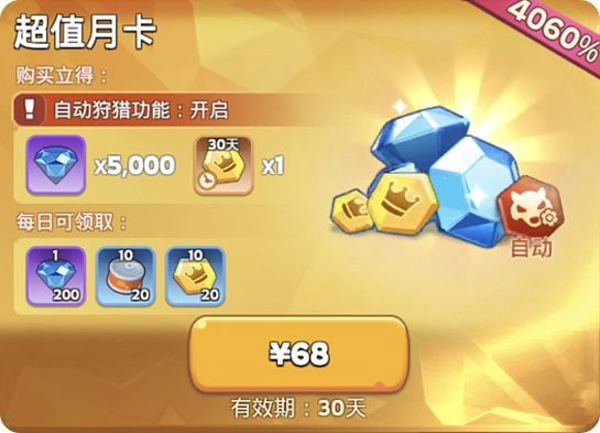 有2个常规周卡以及一个常规月卡,周卡包含加速/装备,月卡为自动狩猎加20罐头。