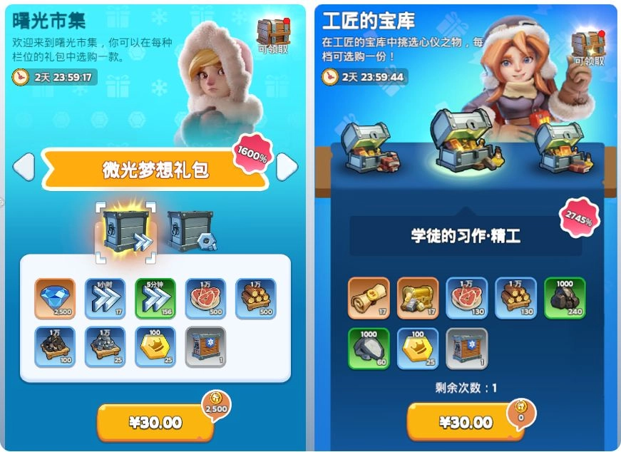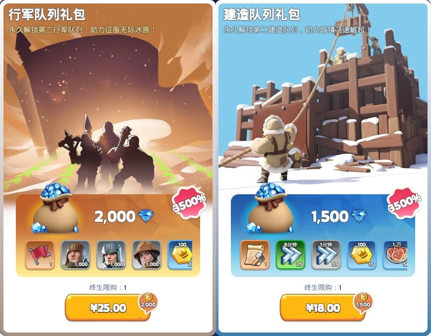 建造队列礼包能够永久解锁第二建造队列,这意味着你能在资源充足的时候,同时升级两个建筑。